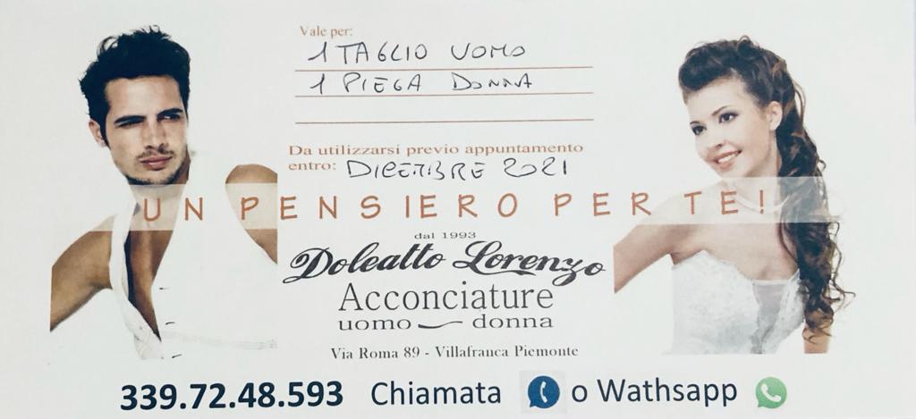 Descrizione "UN PENSIERO PER TE" è indirizzato a chi vuole regalare un servizio (taglio uomo, piega donna, taglio più piega, servizi tecnici oppure semplicemente un buono da per esempio 100,00€ o altre cifre minori o maggiori) a un amico un parente a chi si vuole insomma, la persona interessata deve recarsi presso Acconciature Doleatto Lorenzo e acquistare il buono che consiste in una cartolina (come foto di esempio) pronta da regalare.